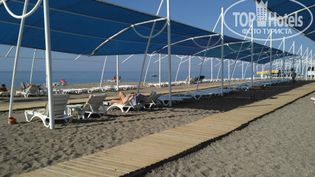 Лежаков на море всегда хватало, в любое время, но первые ряды занимались рано рано утром и потом занявших эти лежаки людей ты мог не увидеть до обеда. Вход в море мелкая галька, не очень приятный, а выход ещё более неприятный. Я бы рекомендовал всё же брать кораллки, мы пожалели что не взяли. Вход резкий, через метра 2 глубина. Само море было тёплое, можно было зайти и не выходить. У бассейна после обеда найти место было крайне сложно, так же всё занято полотенцами и вещами, а самих владельцев этих вещей можно было не наблюдать вплоть до момента забора этих вещей вечером. Бассейн большой, большие горки для взрослых(отдельно) и бассейн для детей с детскими горками.
