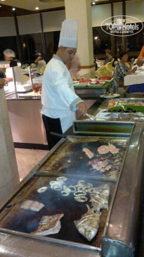Есть возле бассейна кафе с заказом по меню, иногда обедали там, понравилось, вкусно, курочка, свинина, рыба в кляре. Меню в приложении отеля. В основном рестике у каждого блюда табличка с его названием, но не всегда перевод понятен. Мы с мужем не гурманы, питаемся обычной домашней едой, не сьедаем по 10 блюд в каждом приёме пищи, нам было всего достаточно.
