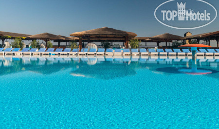 Море. Все лежаки заняты, купающихся людей единицы. Причина, камни и водоросли, которые никто не чистит. Пока мы были, прошелся миниураган, тину выбросило на берег, 3 дня не чистили, запах стоял даже около домиков у бассейна, представляю, как «радовались» жители домиков у моря…