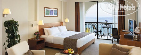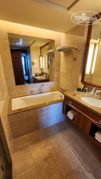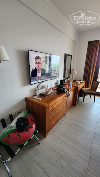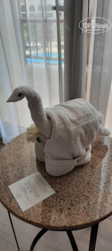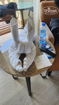 В номере есть всё для хорошего отдыха – мини-холодильник полностью забитый безалкогольными напитками и пивом (мы не пользовались), чайник с чаем, кофе, сливками и сахаром, очень много бутылочек воды 0,5 л, удобная двуспальная кровать, телевизор (без русских каналов), халаты, тапочки. В ванной комнате и душ и небольшая ванная, фен, сушилка, качественные туалетные принадлежности (есть всё: и зубные щетки, и пасты, и резинки для волос, и шампуни и т.д.). Кондиционер работал хорошо, но иногда издавал странные громкие звуки. Уборка номера неплохая, всё пополняют, зайчика из полотенца сделали, но под кроватью был замечен огромный слой пыли.