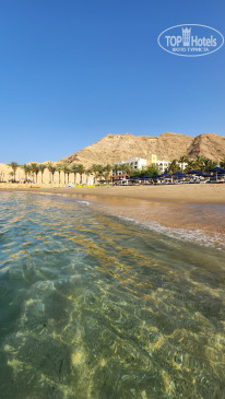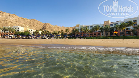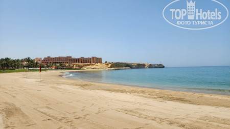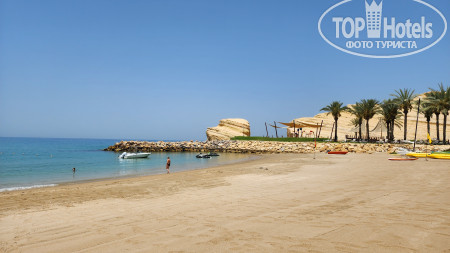 Для нас есть огромная зона для купания, а по факту тебя ограничивают на небольшом пространстве. На берегу песок какой-то не красивый, тёмный. Вечером наблюдаются отливы, утром приливы, но они не существенные, плавать вечером можно, но не так приятно, как утром. Шезлонгов и навесов на всех хватало. В определённые часы угощают канапе из фруктов (это бесплатно... уже не знаешь, что принесут, а потом выставят счёт XD) По вечерам можно покататься на верблюде вдоль берега в пределах 10 минут стоит 5 риал, на коне 4 риала. На пляже предлагают водные развлечения, они все, естественно, платные, включая снорклинг.