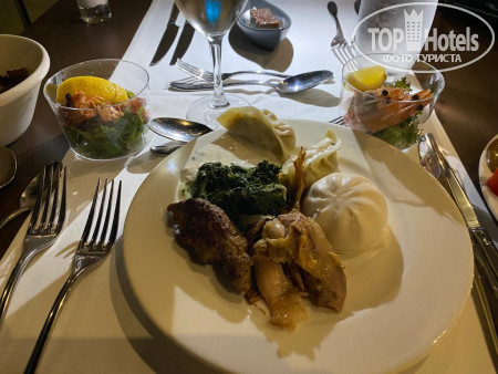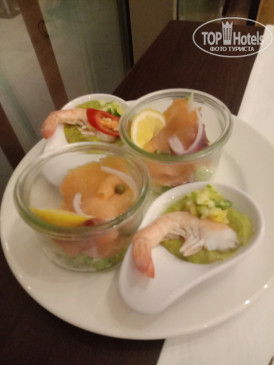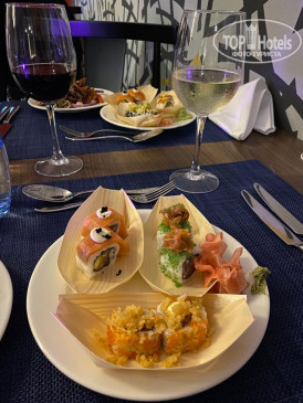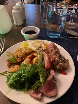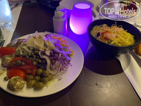 Даже на фоне хороших турецких отелей, питание реально классное. Не могу сказать, что какое-то безумное разнообразие, но все весьма и весьма съедобно. Понравилось, что основные блюда, например, мясо, рыба и курица выложены в нескольких точках, чтобы не было битвы голодных и очередей. Морепродукты в виде креветок, кальмаров, осьминогов каждый день, но креветки на гриле готовить не умеют откровенно, сухие невероятно. Моя персональная любовь - азиатские супы типа том-яма, при тебе отваривают и заливают бульоном по вкусу. Классно готовят запеченную баранину, нежная и совсем без запаха. Из оригинального давали что-то типа мини-стейков из тунца, все как положено, пара миллиметров снаружи обжарена, внутри красный. Вкусная кондитерка, пирожные и мини-корзиночки с фруктами весьма хороши, а вот мороженое водянистое. Много разных сыров, включая плесневый. По фруктам скромно, дыня, арбуз, ананас, яблоки, маракуйя, драконья ягода, но ананасы классные, не хуже кубинских. В спортбаре можно перекусить в перерывах работы основного ресторана круглосуточно, гамбургеры, хотдоги, сэндвичи, фрукты. Понравилось, что гамбургер дают в виде булки с котлетой, овощи и соус сам кладешь по вкусу. Ходил в ливанский ресторан алякарт, но не понял смысла, там почти те же самые блюда и шведский стол. Единственный прям провал по питанию - они используют какой-то чудовищно кислотный кетчуп, все блюда типа лазаний, или которые предусматривают томатную подливку, есть невозможно, как будто тебе туда лимонной кислоты еще плеснули. Бары прекрасные, стандартные коктейли мешают вкусные, алкоголь не люксовый, но и не ноунейм, например, ром льют белый Бакарди. Можно попросить к пиву какие-то орешки. В лобби-баре вполне приличная кофемашина. Лобби-бар круглосуточный, но алкоголь не подают с 2:45 до 10 утра, может, оно и к лучшему. Почему-то много народу пило текилу)))) Моя персональная любовь - бар Коралл возле бассейна, с 20:00 до 23:00 там очень атмосферная подсветка светильниками и мало народа, полный релакс.