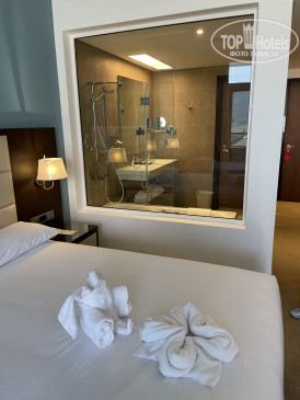 Номер достался на втором этаже в левом крыле с видом на аквапарк и детский лягушатник, боковой вид на море в наличии. Как я понял, большая часть второго этажа занята техническими помещениями, поэтому до номера от лифта достаточно большой пеший переход, но пока идешь, можно полюбоваться видом на город. Конечно, если его не закрыло смогом, как обычно))) Номер достаточно большой, очень чистый, хотя местами уже просится небольшой косметический ремонт. Необычная фишка - наличие вентилятора, зачем нужно, непонятно, но прикольно) Раковина в санузле двойная, может быть удобно, если отдыхаешь не один. Так как отель 4 звезды, халаты и мыльно-рыльные не предусмотрены, в наличии мыло-гель для душа и бальзам для волос, но с приятным запахом и достаточно качественные. Кровать удобная, рядом есть розетки, но розетки американские, не забудьте переходник (или купите его в отельном магазине). В розетки также встроен двухамперный USB-разъем, для зарядки телефонов хватает. Минибар безалкогольный из газировок и воды, пополняют раз в два дня, порадовало наличие тоника и содовой Швепс. ЕСть чайник и кофемашина, даже сливки порционные положили. Убираются хорошо, не филонят, при наличии некоторого объема чаевых могут скрутить прикольную фигурку)))