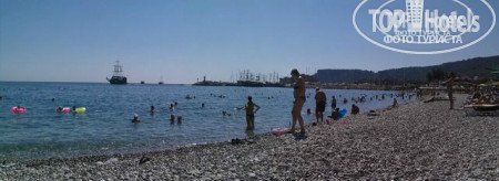 От выхода из отеля до пляжа — буквально 50 шагов (30 секунд и вы на пляже). Это невероятно удобно. Утром не нужно планировать поход на море, ждать трансфер, можно просто выйти с крыльца и уже море. Забыли что-то в номере? Не проблема, сбегал и принес. Пляж чистый, галька, море прекрасное. Лежаки бесплатные, в отеле выдают полотенца для лежаков.