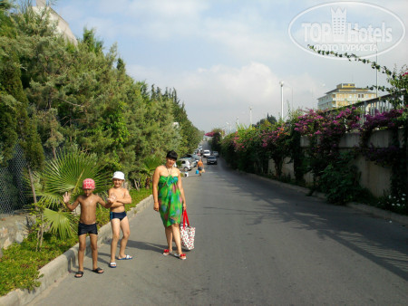 Дороги на пляж две, та что по дороге дублеру, на лево через переход от отеля-не приятная, не удобная. Лучше сразу пойти на право от отеля(если стоять лицом к морю), дойти по тротуару до отеля Антик(по дороге 2 магазина)и там перейти подземный переход, окажетесь на пляже отеля Антик, далее на право еще минуту до пляжа Арабеллы.